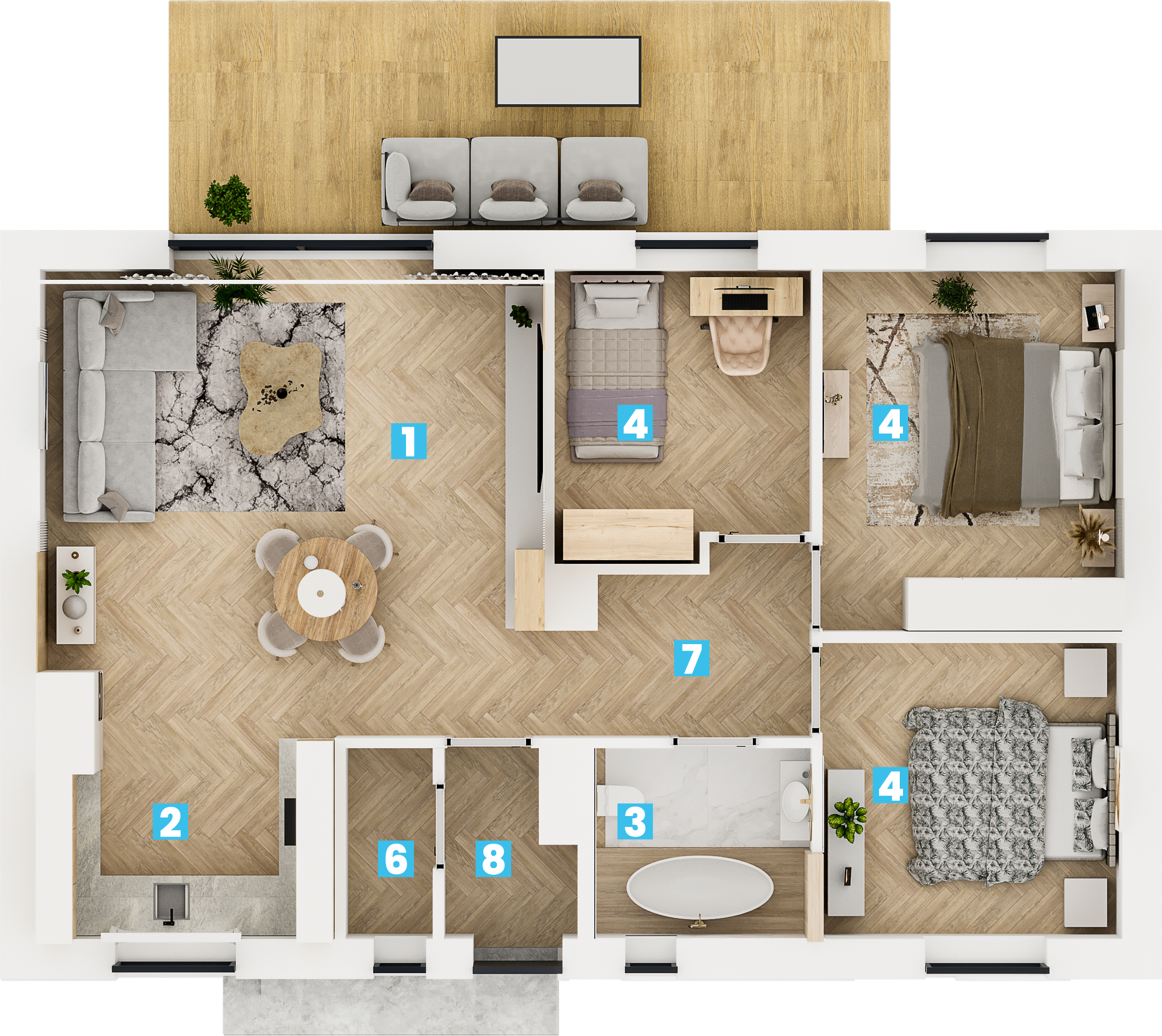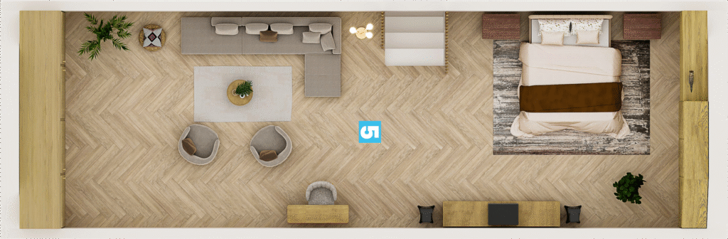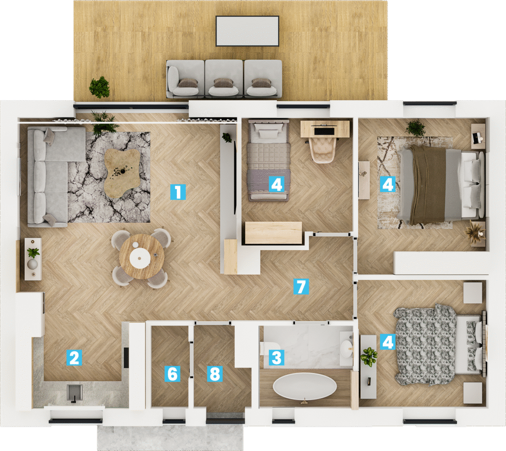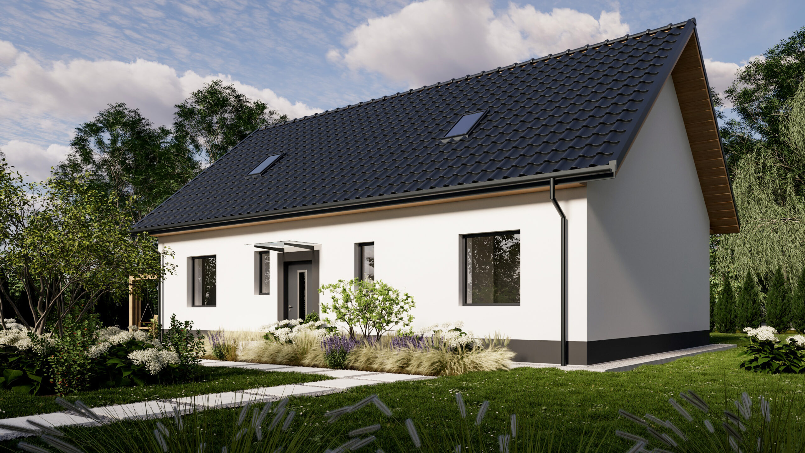 Taki układ jest niezwykle funkcjonalny. Strefa frontowa (6 metrów) tworzy reprezentacyjne podejście do domu, zapewniając bufor od ulicy. Największą zaletą jest bardzo duży, słoneczny ogród z tyłu posesji (ponad 16 metrów długości). Taka przestrzeń daje ogromne możliwości aranżacyjne – idealnie nadaje się na stworzenie rozległego tarasu, miejsca na basen, placu zabaw dla dzieci lub po prostu cichej strefy relaksu. Szerokość działki (ponad 20 metrów) gwarantuje poczucie prywatności i komfortu.