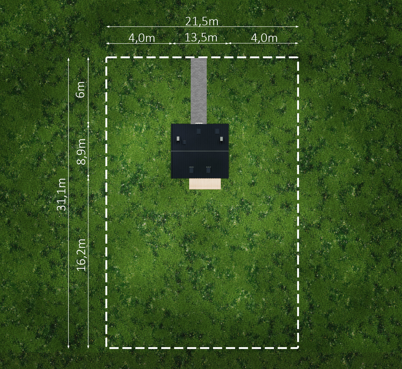 Położenie budynku: Na działce zlokalizowany jest budynek mieszkalny z dachem dwuspadowym. Usytuowanie domu zapewnia zachowanie komfortowych odległości od granic: 4,0 metry od granicy lewej oraz 4,0 metry od granicy prawej. Od frontu do budynku prowadzi 6-metrowa ścieżka, wyznaczając strefę wejściową. Kluczowym atutem jest jednak przestrzeń za budynkiem – do tylnej granicy działki pozostają aż 16,3 metra.